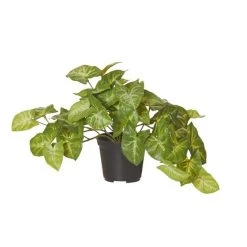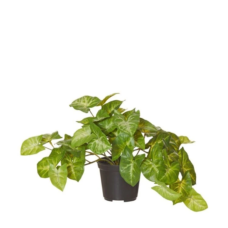 Fill your home with the lush, lively look of natural greenery with the Rogue Syngonium In Garden Pot, featuring amazingly life-like bright, glossy leaves of variable heights and sizes. Part of the plant’s character is its shape – the foliage meanders outwards with abundance. Perfect for adding a luscious look to your desk, bedside or bathroom. The plant comes in a simple black plastic pot, so you can easily slip it into a decorative outer pot, footed planter or even a woven hanging basket.
