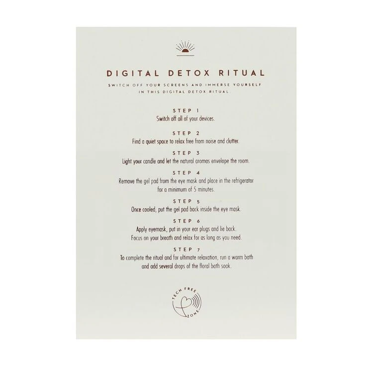 | Contents | 1 x 200 g Lavender & Bergamot Scented Bath Soak1 x 80g Lavender & Bergamot Soybean Wax Candle1 x Bamboo Silk Cooling Eye Mask with Gel Pad Insert1 x Ear Plug Set1 x Step-by-Step Guide to the Perfect Digital Detox Ritual |